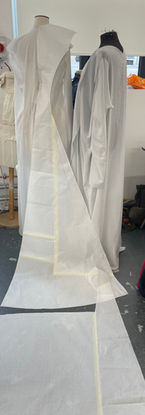 Interpretation of design by Bob Mackie for Cher (1976), comprised of a peignoir-style gown, corset and bloomers, styled with vintage shoes and tights.